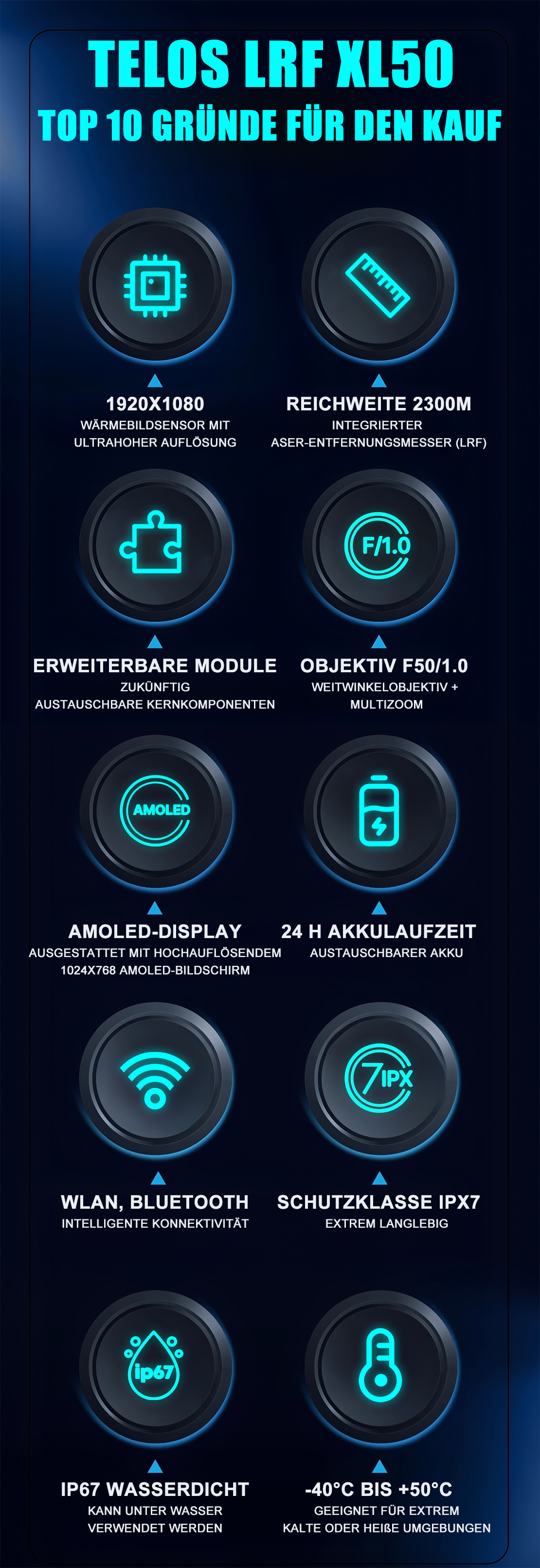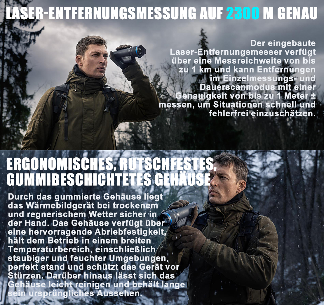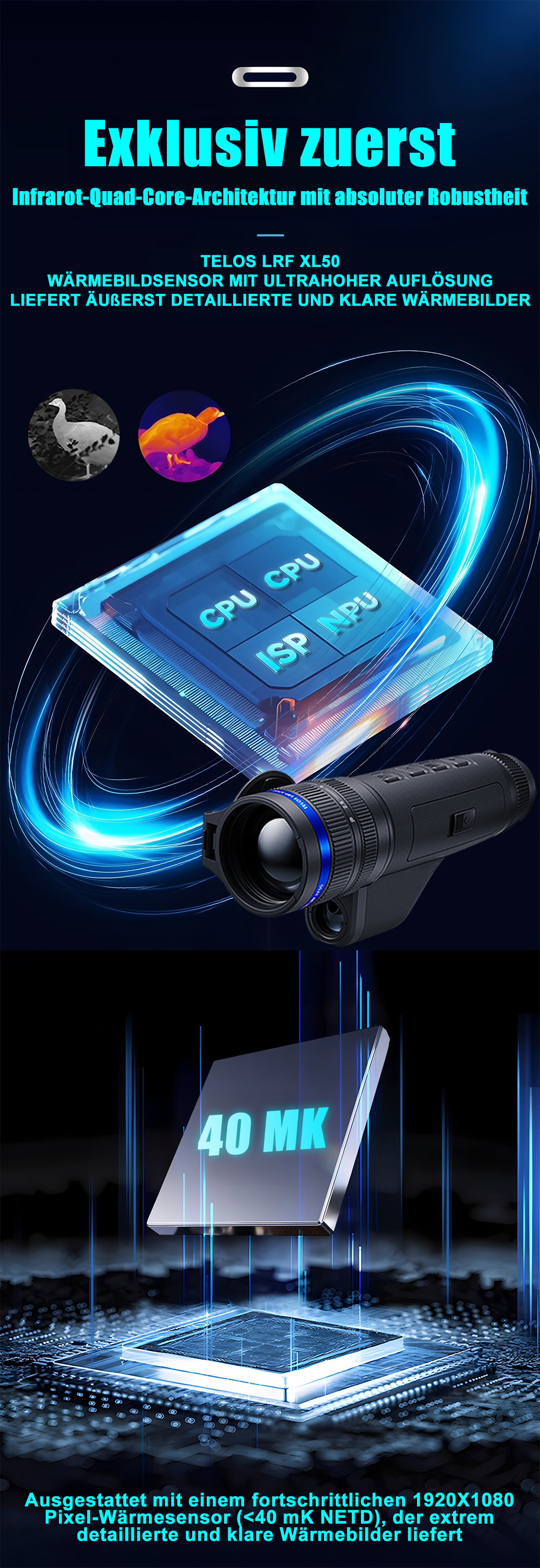 TELOS LRF XL50 Serie ist ein Wärmebildmonokular im Taschenformat mit einem Gewicht von weniger als 1kg – ideal für Outdoor-Abenteuer. Es hilft Ihnen, Ihre Umgebung wahrzunehmen und Objekte in bis zu 2.000 Metern Entfernung mühelos zu erkennen. Die Bedienung ist einfach und schnell erlernbar. Das TELOS LRF XL50 ist der perfekte Begleiter für die Wärmebildjagd oder Ausflüge in die Natur, egal ob im Dunkeln oder im eigenen Garten.