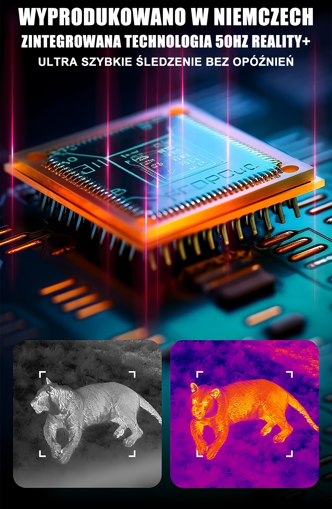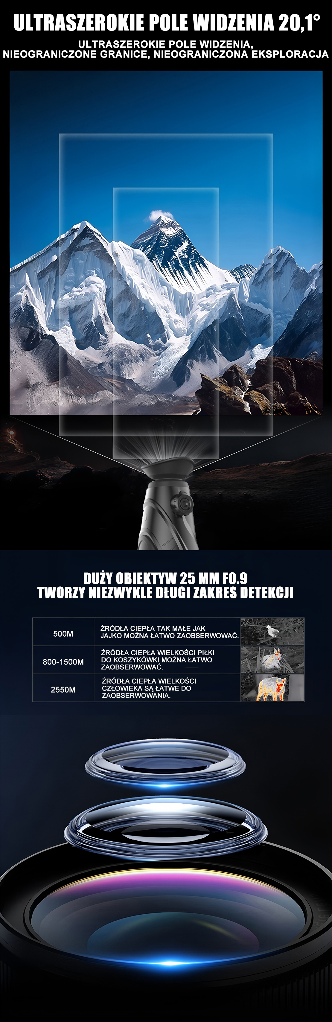Czujnik termowizyjny 640x480 zapewniający doskonałe możliwości wykrywania. W zależności od modelu seria V3.0 może wykrywać cele średniej wielkości z kamizelką w całkowitej ciemności z maksymalnej odległości 2597 metrów.